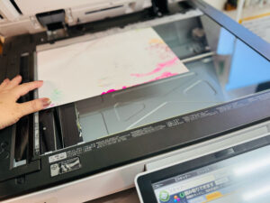 こちらは、スキャナー取り込みの写真です。この後アートをガラス面に当て蓋を閉じパソコンなどと繋ぎながらスキャンしていきます。(この写真は分かりやすくアートを上向きにしています。)