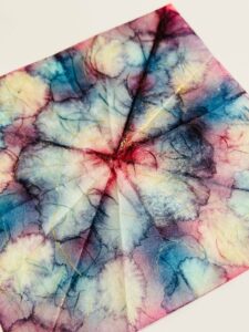 薄い和紙は染み込みが早いので、折った状態で色を染み込ませています。(草木染めと似たような感じ)