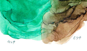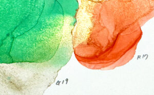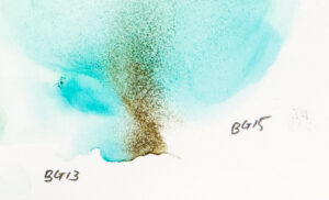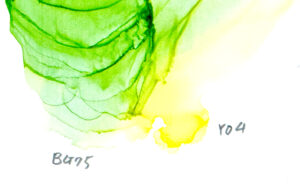 BG系のインクに、Y02(カナリア・イエロー)など黄系のインクを、ごく少量(1滴程度)混ぜると、青みが抑えられ、鮮やかでクリアなエメラルドグリーンが発現します。