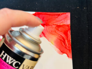 独自手順:濃い赤を垂らしたら、すぐに上からエタノールを重ねず、濃い色の「フチ」に向かって淡い色を流し込むように風を当ててください。