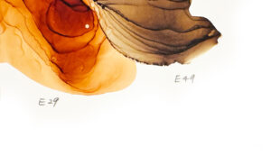 作品が完成した後、ピニャータ ホワイトなどの顔料系白インクをごく少量、アクセントとして脈や縁に垂らし、すぐに固めます。白が持つ強いコントラストが茶色を引き締め、ラグジュアリーで洗練された印象へと変化させます。