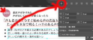 段落のパネルから揃えを選択したり、整列を使って文字を揃えていきます。BOXをイメージして文字を揃えていくとまとまりのある文章としてみやすくなります。